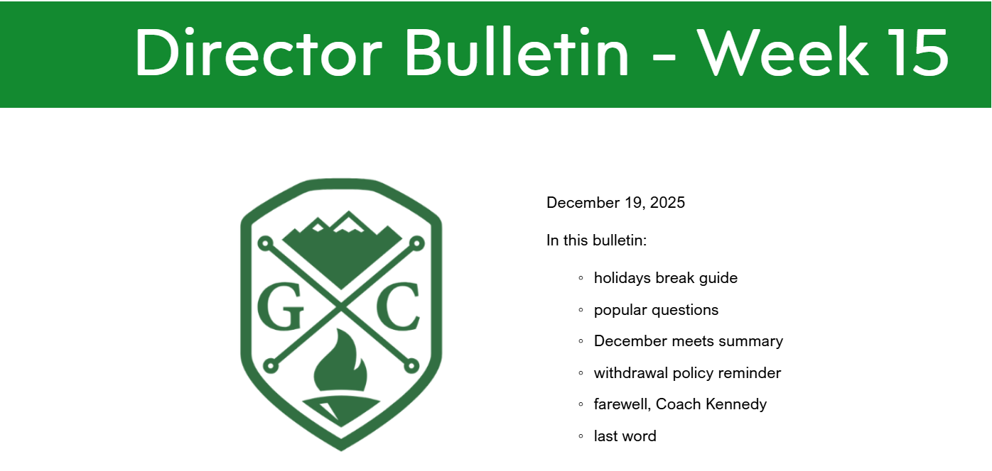 This bulletin highlights the holiday break, upcoming events, program details, and celebrates the achievements of our swimmers and contributions of our coaching team, including Coach Kennedy, who has been an important part of our community and will continue to support the team on occasion